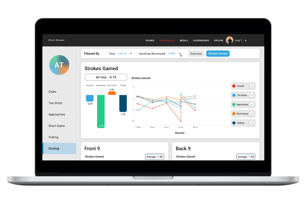 The online dashboard and Shot Scope mobile apps both provide access to performance statistics including how far you hit each club, tee shot distance and accuracy, approach shot proximity, short game scrambling success rate, putting and much more.